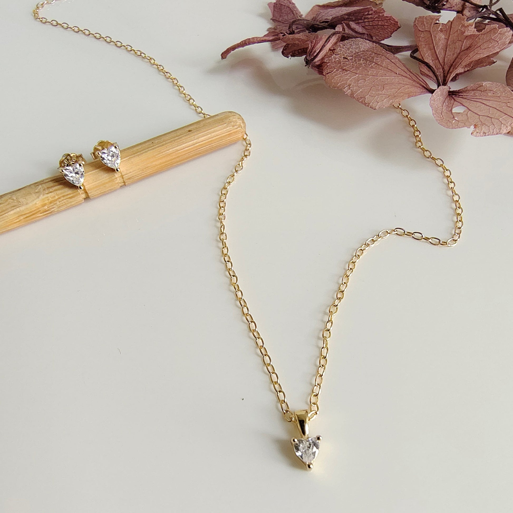 Hermoso Set de aros y collar Punto de Luz en forma de corazón. Plata Dorada 925