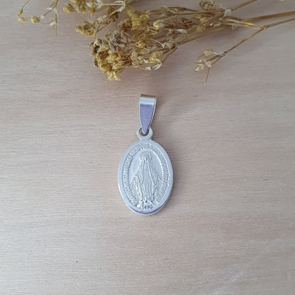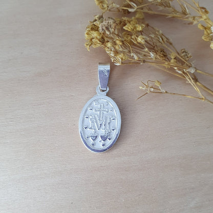 Con medidas de 1.5 cm de largo por 1 cm de ancho, la medalla es pequeña pero significativa, permitiendo apreciar cada detalle del diseño. La plata 925 asegura un acabado brillante y duradero, destacando la fina artesanía.